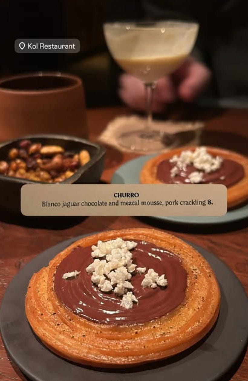 In a stroke of true brilliance from the bf, he booked us in at the bar of a 2024 Michelin star-winning Mexican spot called KOL where you can get the drinks and light bites for a muuuuuch cheaper price. This was our fantastic desert, but all of it was mind-blowing.