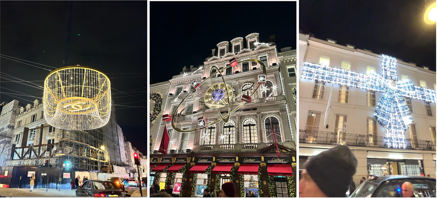 I will say as a New Yorker, I am a total snob (or Grinch maybe – it’s been a bit of a theme in my content oops) about holiday lights and am rarely blown away, but London truly has us beat in that department. These displays were AMAZING! It also inspired me to do some vintage luxury searching (here’s a gorgeous Cartier tri-fold black leather wallet for $75, a Dior sporty fleece/jacket for $85, and Chanel aviator sunnies for $73).